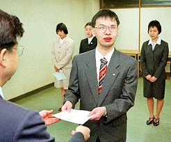 | 三日午前、大阪府教委で図書館司書の辞令を受け取った杉田さん |